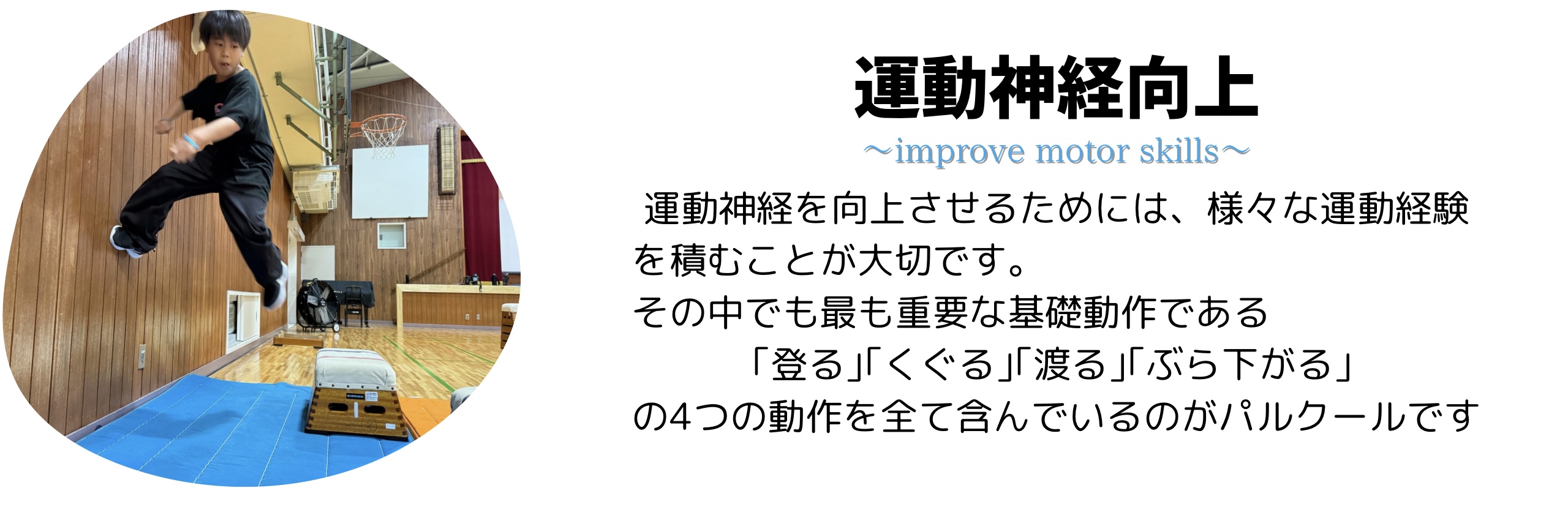 細い場所で着地を止める、壁を登るなどのパルクール独自の動きで姿勢保持筋を鍛え、とくに体幹やバランス力をアップさせます!